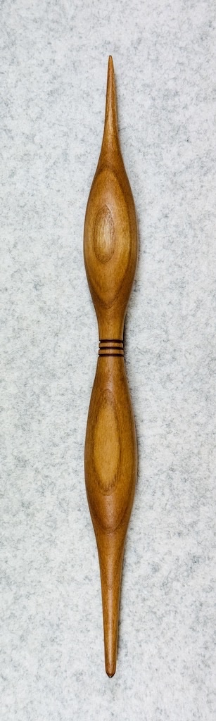Das schöne Holz des Apfelbaums, verbunden mit der Länge und dem Design, geben der Spindel Schwung, der das Spinnen zum Genuss macht.