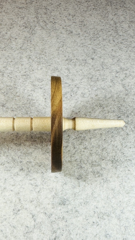 In eine klassischen Wirtelform gebracht, ist es eine wunderschöne Handspindel geworden.